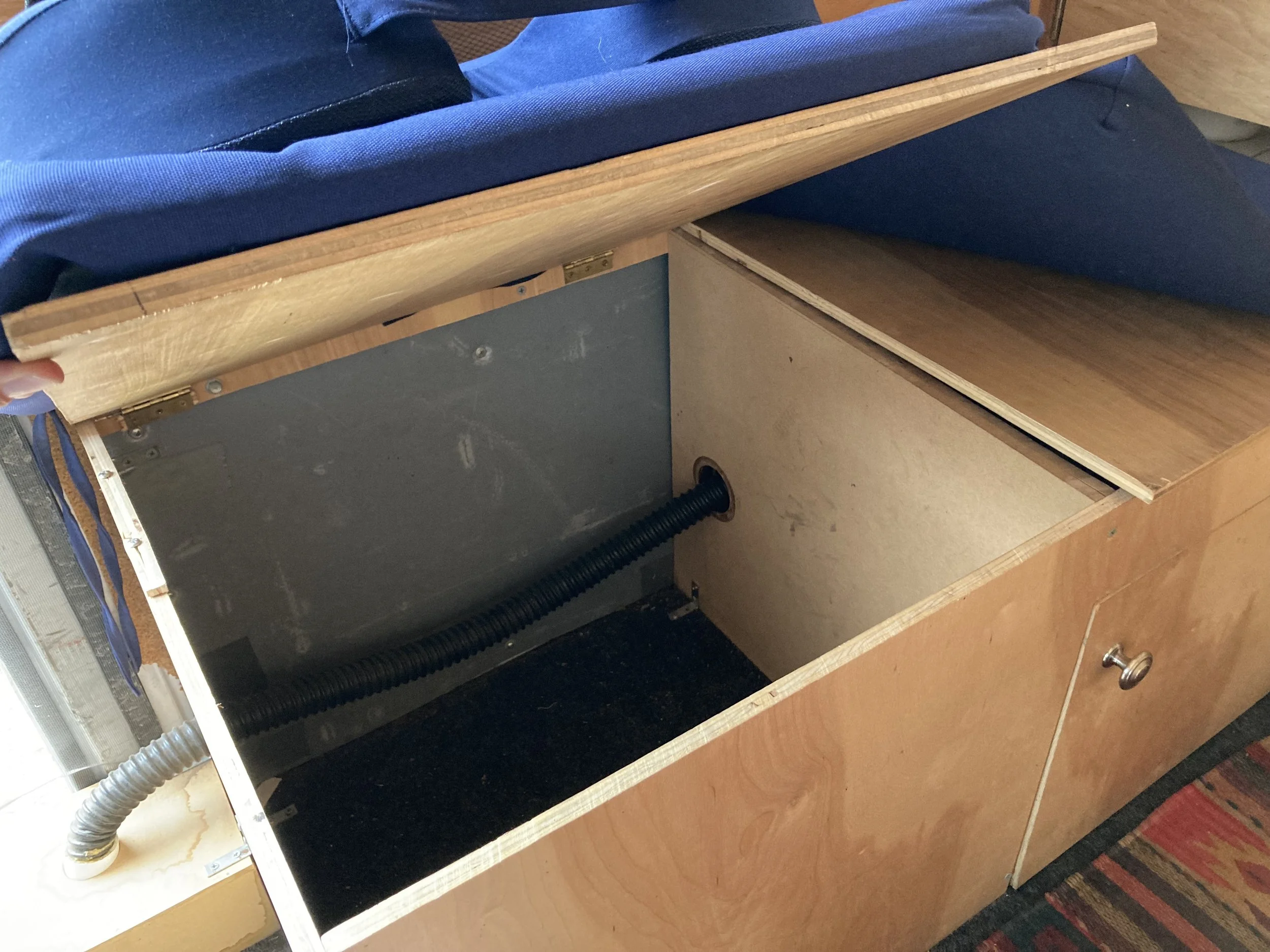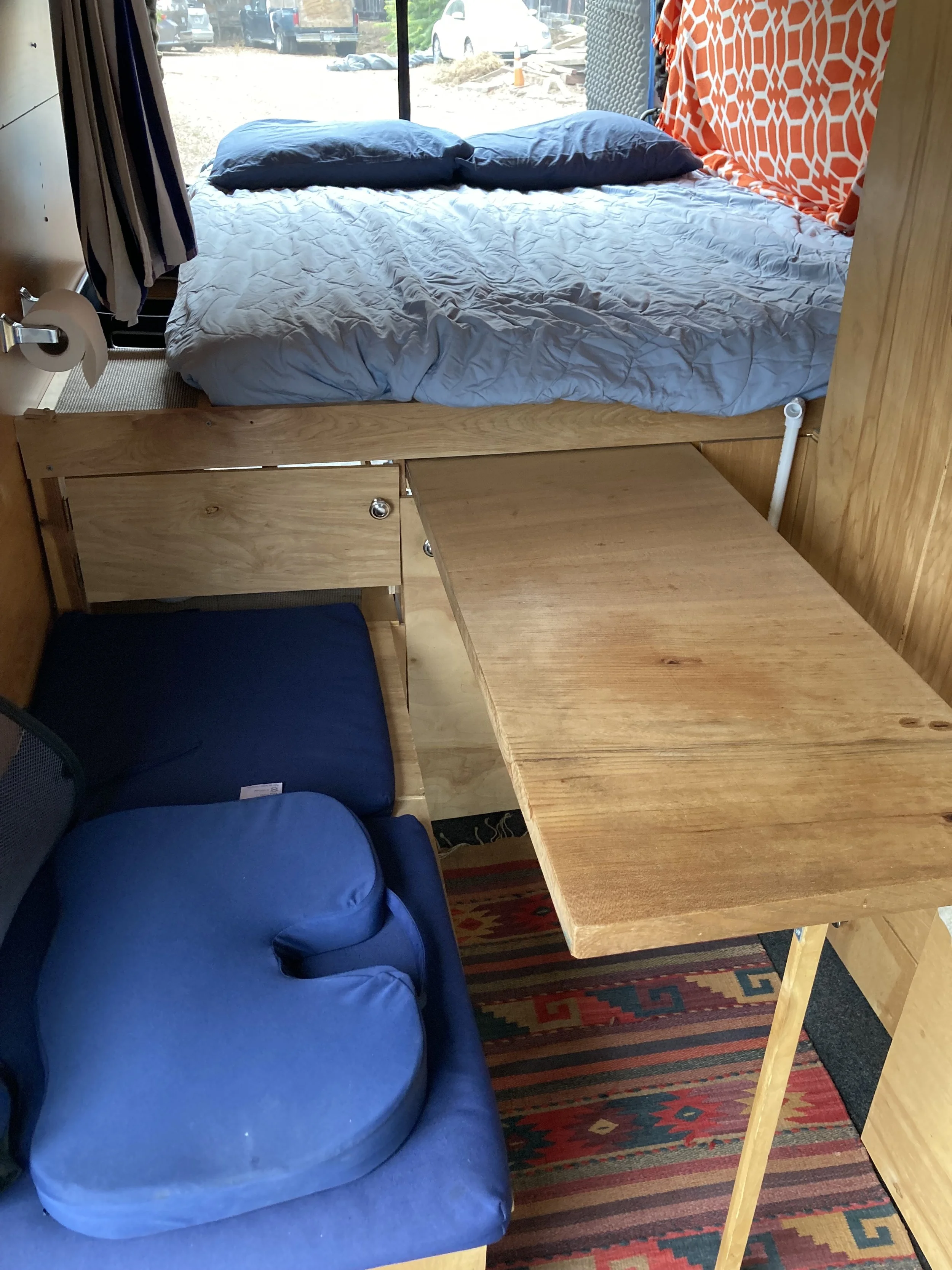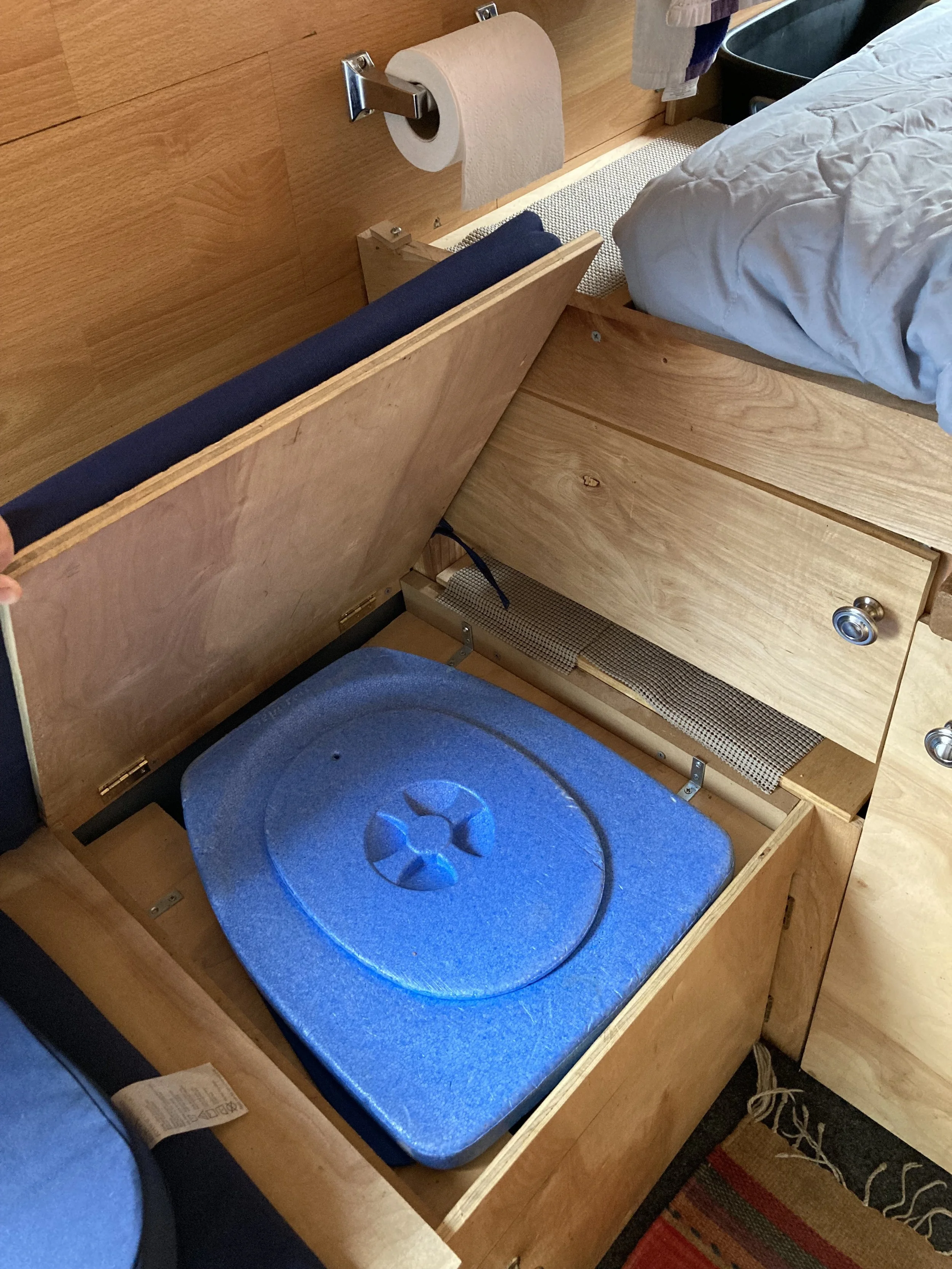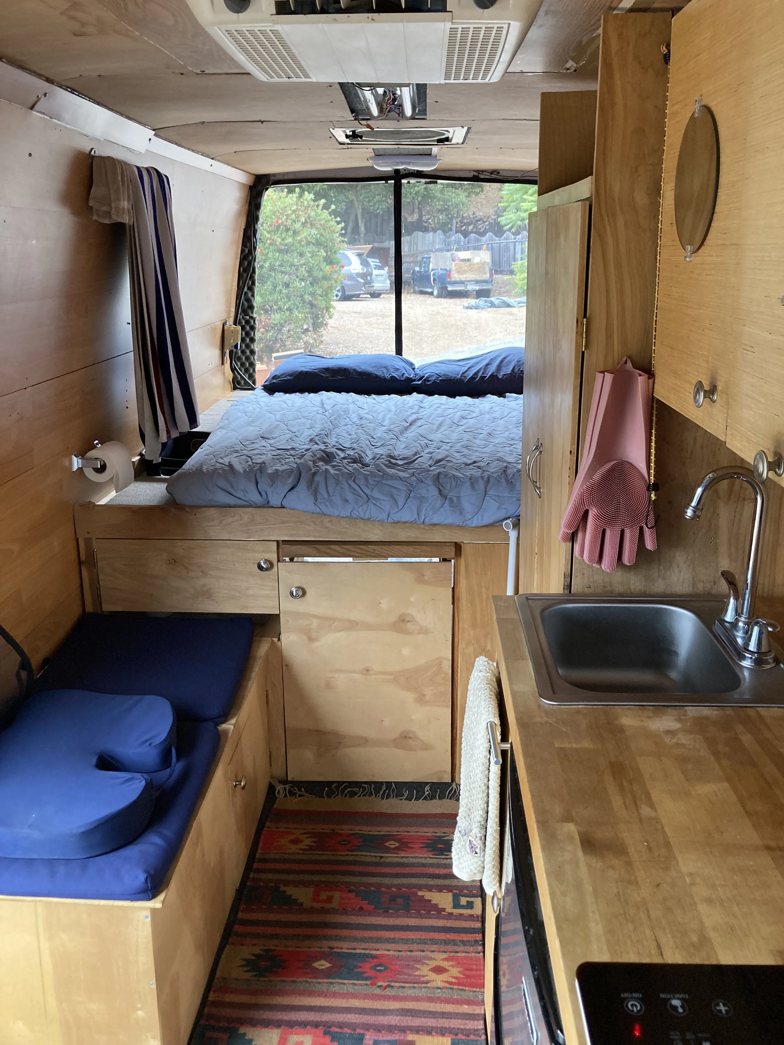 Zero waste: I wanted to reuse or recycle all my waste streams, and I knew that storing and pumping out greywater would be a hassle. So I designed my sink water to drain out the side of the van and hook up to a pipe flowing into a patch of bamboo, providing them with nutrients and water. I also designed a DIY composting toilet with a urine diverter. For the solid waste I used bokashi fermentation to neutralize the odor and reduce pathogens in a bucket. Then I later buried it in the ground where it would more rapidly turn into soil. The urine I emptied into a pile of composting wood chips (the high nitrogen of urine is a good combination for composting with the high carbon of wood chips).