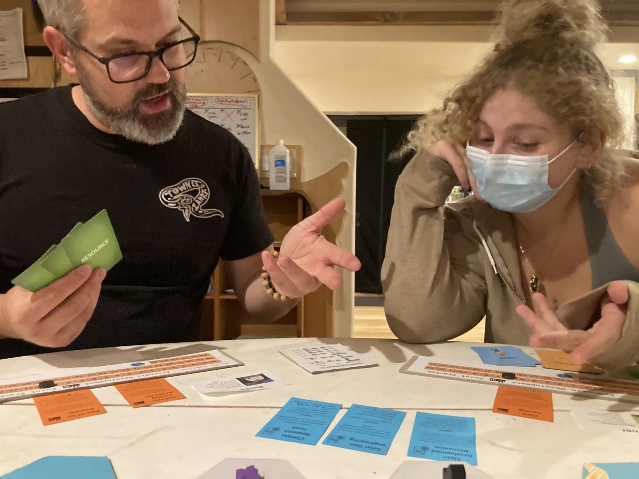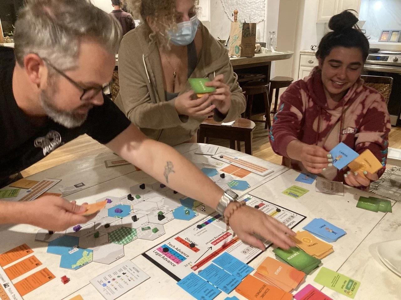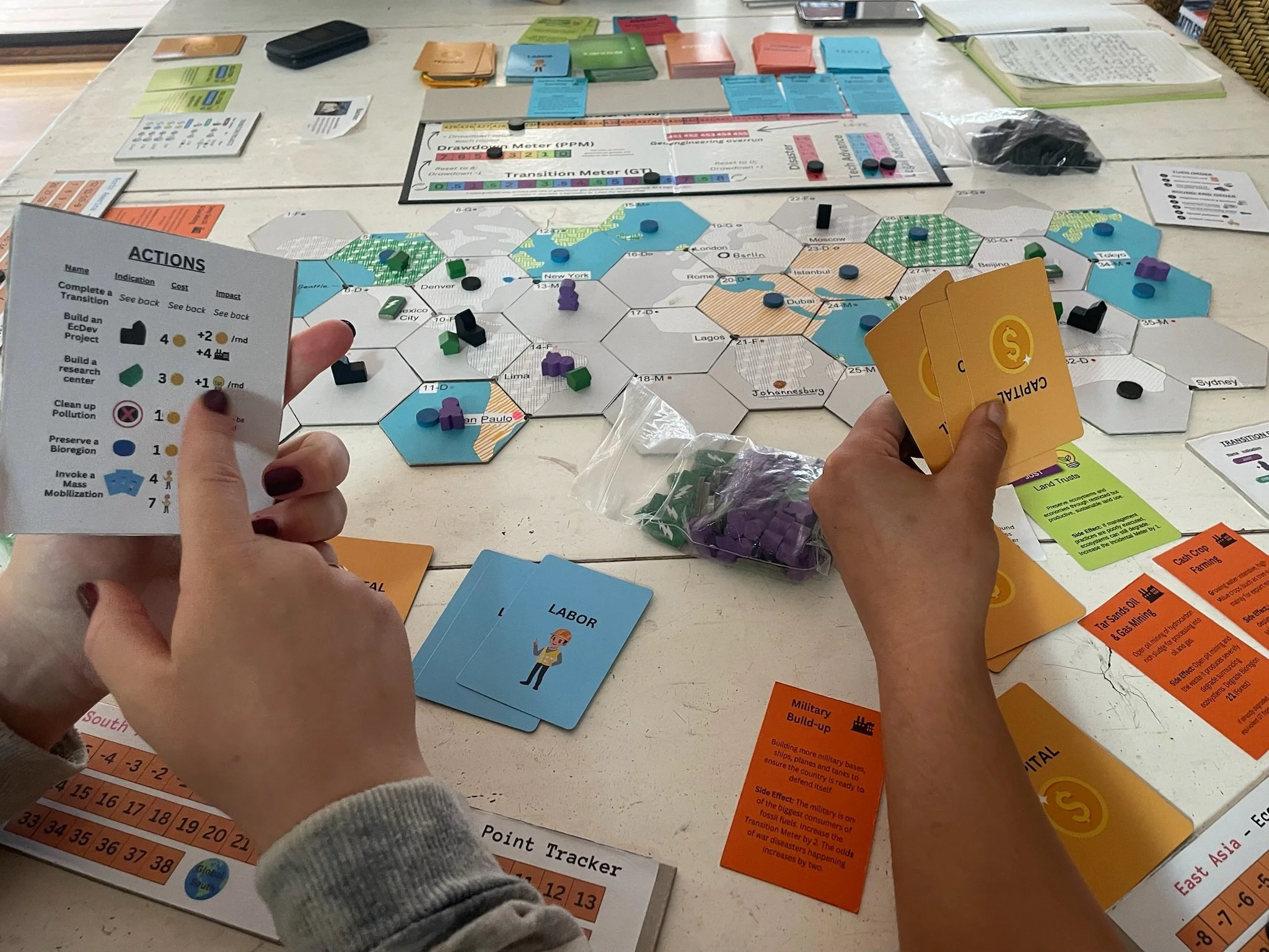 Players can collectively win the game by staying inside the planetary “Donut” (see Donut Economics). This means achieving all three of the global objectives by the end of a round, AND each player having a Just transition on EVERY bioregion in their bloc. If every bioregion in play is NOT Just transitioned, the player with the most EcDev points wins.