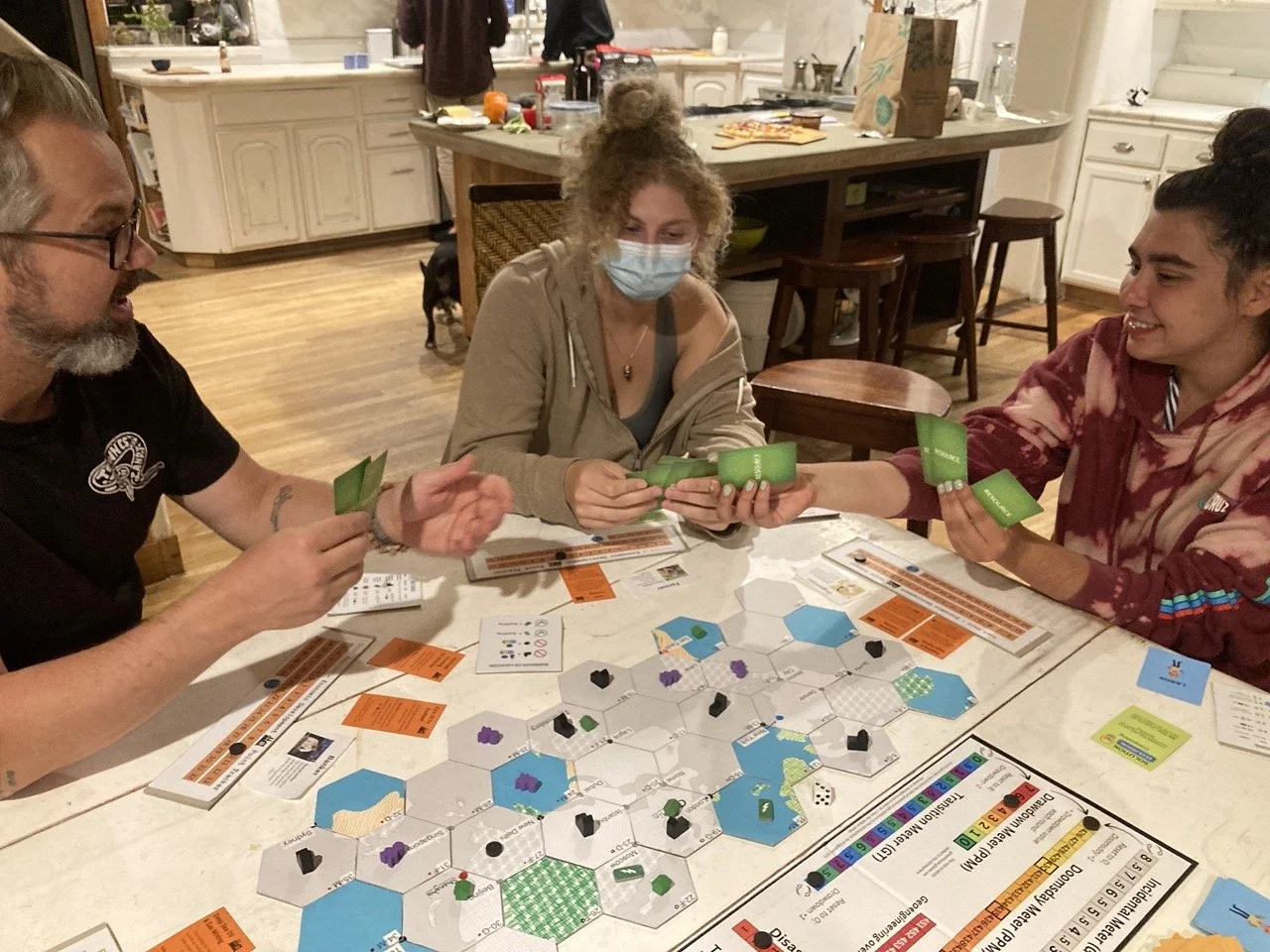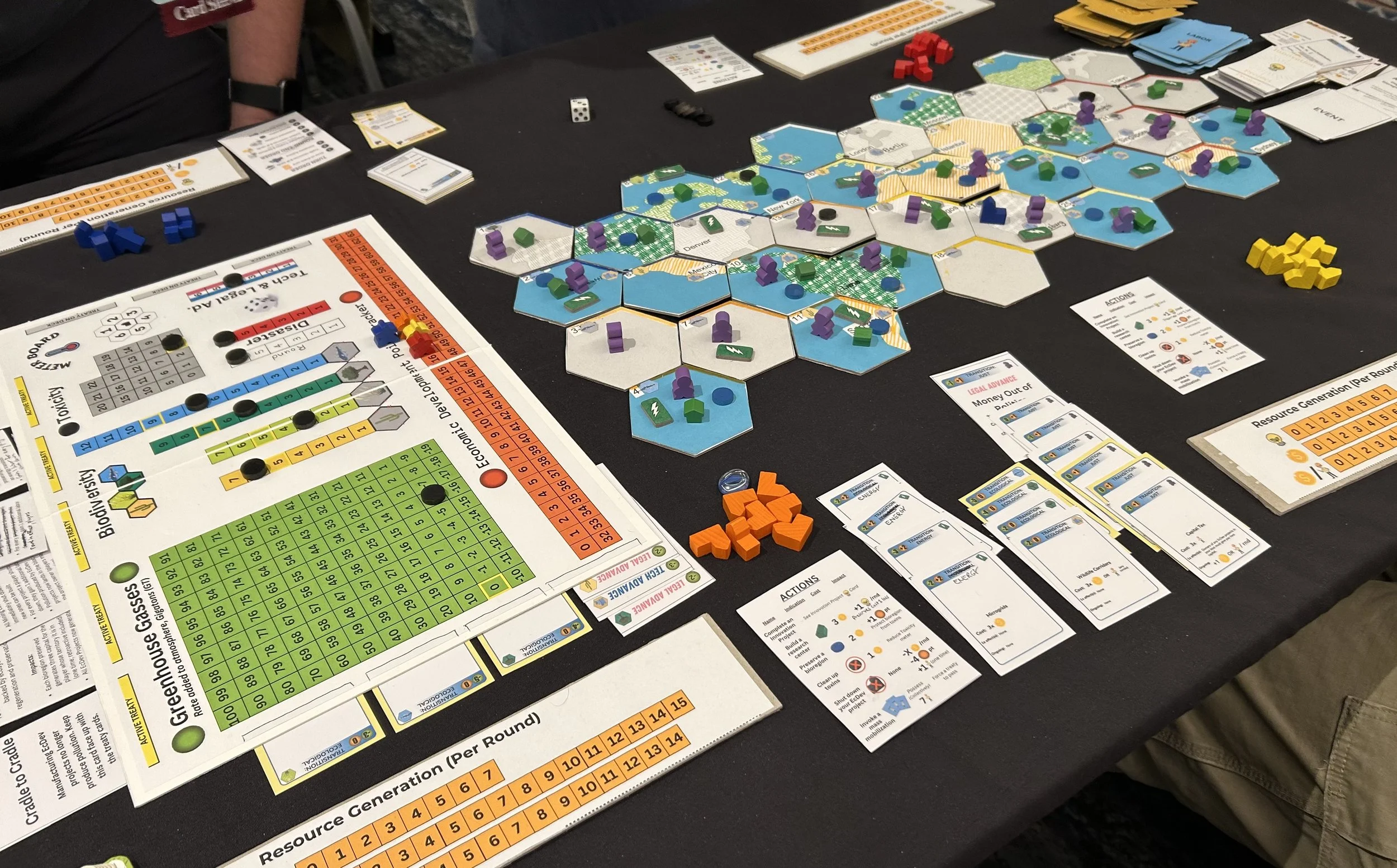 The main board of the game consists of 35 hexagonal tiles that represent different bioregions. All the action of the game takes place in these bioregions, while greenhouse gas accumulation (which determines when the game ends) is tracked on a “meter board.” Players earn individual economic development points based on projects completed in their territory (group of seven bioregions).