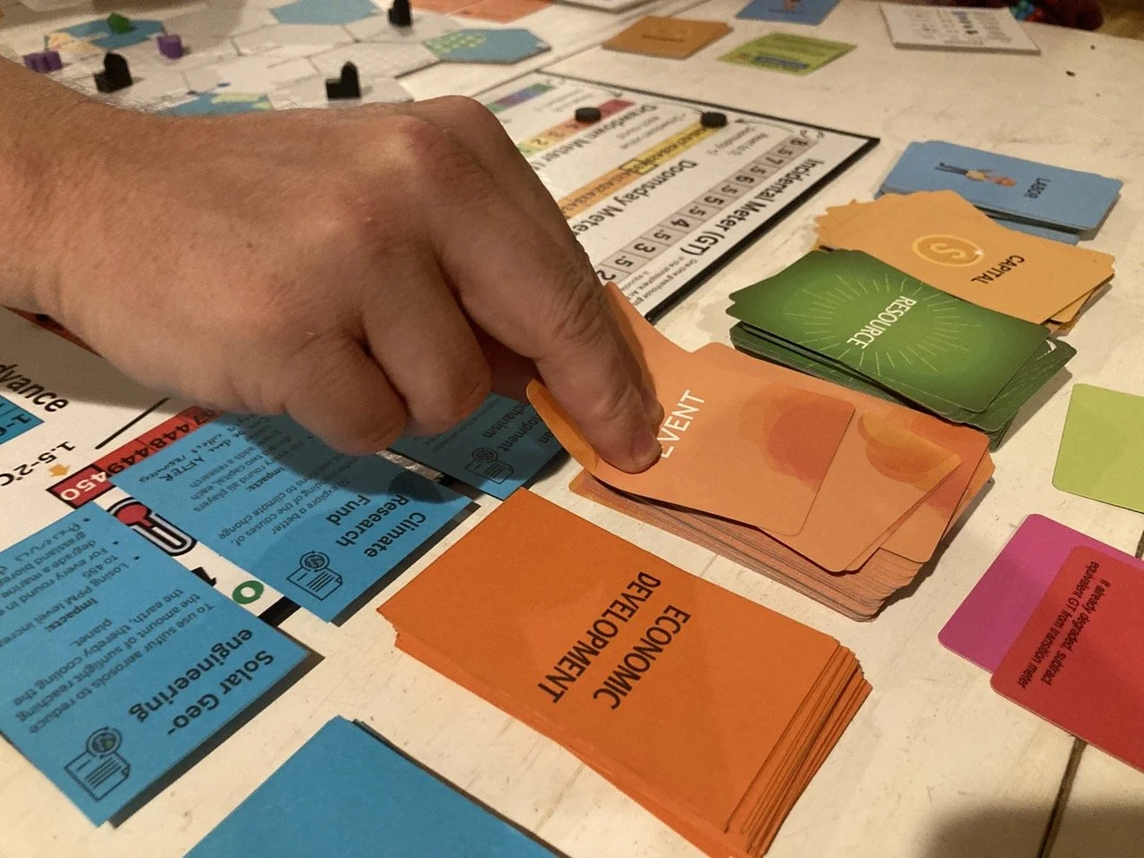 Players use their resources to carry out as many actions as they can. Actions can give players economic development points (but often increase greenhouse gasses), give them more resources, or reduce greenhouse gasses. Sometimes they do more than one of these things. Oh the choices!